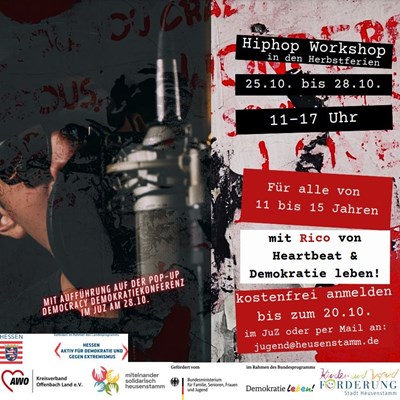 Rico Montero von Heartbeat Edutainment war schon mehrfach in Heusenstamm – zuletzt mit dem Heartbeat-Bus (mobiles Tonstudio) in den Herbstferien 2022. In diesem Jahr begleitet er den Hiphop-Workshop im Juz. In den vier Tagen lernen die Teilnehmenden, wie Hiphop entstanden ist und welche Bedeutung er für unsere heutige Demokratie hat (Einführung in die Welt des Hiphops). Dann wird es ganz praktisch: Gemeinsam wird ein Song geschrieben, der viele positive und motivierende Botschaften enthalten soll – so bekommen die Kids im wahrsten Sinne des Wortes eine Stimme, mit der sie ihre eigenen Erfahrungen und Emotionen ausdrücken können. Schließlich gibt es noch ein Stage-Coaching für die Aufführung auf der Pop-up Democracy Demokratiekonferenz im Jugendzentrum am Abschlusssamstag.