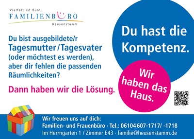 Für Fragen zu den Konditionen, den Wohnungen/zum Haus oder zu anderen Punkten stehen Katrin Roth und Eva Knitsch vom städtischen Familien- und Frauenbüro im Rathaus telefonisch unter 06104 607-1717 und 06104 607-1718 sowie per Mail an familie@heusenstamm.de zur Verfügung. Und wer noch keine ausgebildete Tagesmutter oder Tagesvater ist, aber Lust bekommen hat diesen Beruf in Heusenstamm auszuüben, meldet sich bitte ebenfalls unter den angegebenen Kontaktdaten.
