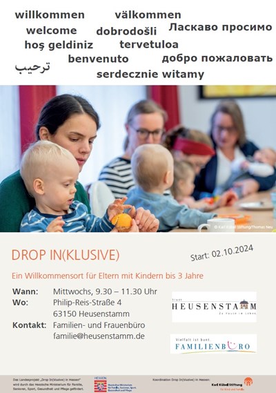 Das Elterncafé Drop In(klusive) wird begleitet von den Mitarbeiterinnen des städtischen Familien- und Frauenbüros in Kooperation mit der Karl Kübel Stiftung für Kind und Familie. Das Angebot wird durch das Hessische Ministerium für Familie, Senioren, Gesundheit und Pflege gefördert. Eine Anmeldung ist nicht erforderlich.
