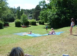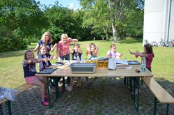 Für die Kinder war es toll, dass sie auf dem Campusgelände weitläufige Wiesenflächen und ganz viel Platz zum Spielen hatten. Es wurde viel in Kleingruppen übers Grün getigert oder mit den Gummihüpfpferdchen geritten, mit dem Pferdegeschirr Pferdchen gespielt, Stöcke gesammelt, Slackline gelaufen, Ballspiele gespielt und so weiter. Daneben gab es viele weitere besondere Angebote - gerne auch unter Verwendung von Naturmaterialien. So bastelten wir Traumfänger und Flöße aus Ästen, stellten selber Farben aus Blättern und Beeren her und bemalten anschließend unsere Baumwollmäppchen damit, kreierten Henna-Tattoos, besprühten T-Shirts, schöpften Papier und und und.